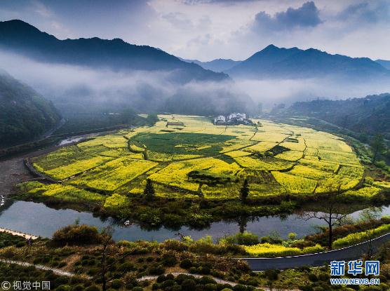 航拍中国泉水鱼乡——安徽黄山板桥呈村八卦田油菜花海,其天然圆形与青山绿水、古村落相得益彰,一条巨型“泉水鱼”赫然出现在呈村油菜花海中。(图片来源:视觉中国)